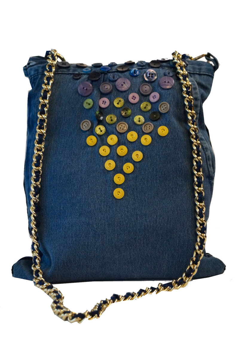 Borsa in denim con bottoni colorati applicati. Ideale per un pubblico giovane che ama essere originale e alla moda.