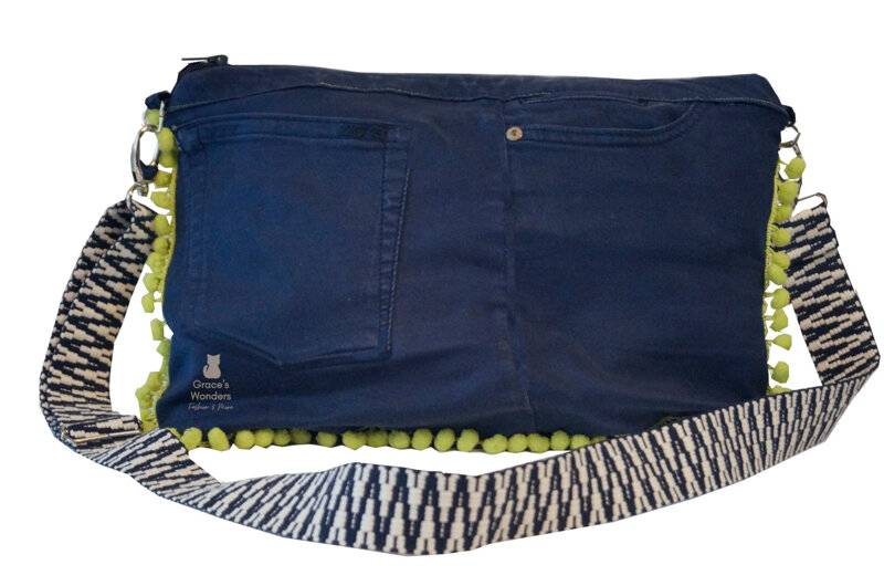 Borsa in cotone stretch con decorazione pon pon disponibile in vari colori. Foderata internamente con comode tasche porta tutto.