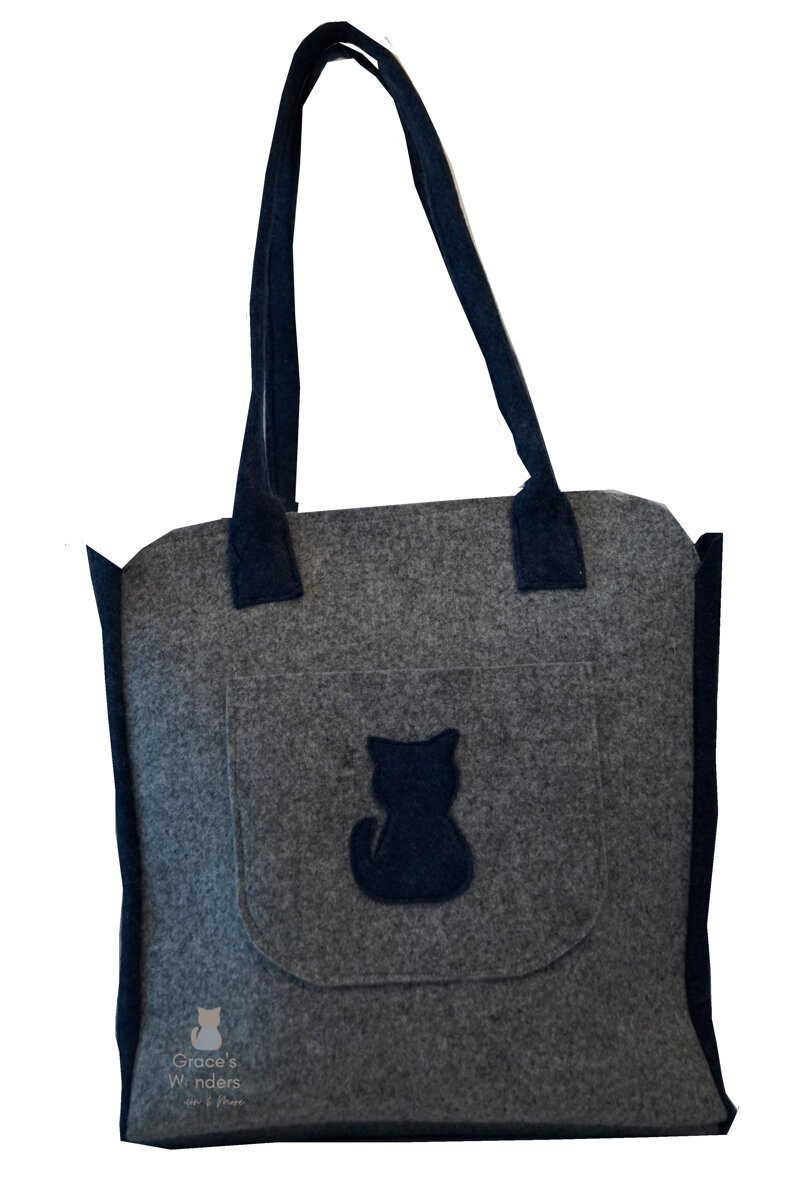 Borsa rettangolare in feltro con base rigida, doppio colore blu e grigio. La linea è morbida, elegante e pratica.