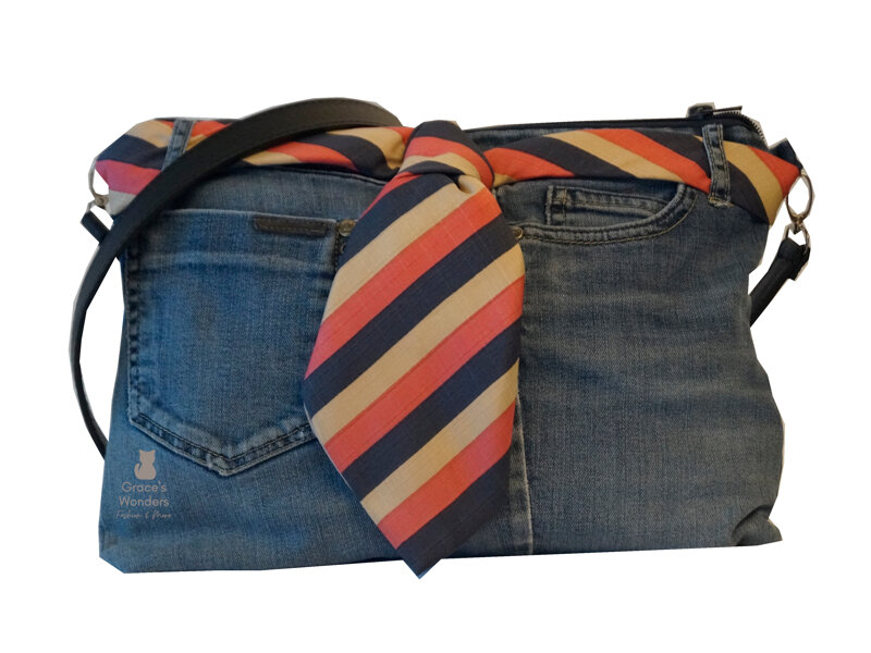 Borsa in denim con decorazione cravatta anni'70 stile vintage. Foderata internamente con comode tasche porta tutto. Ideale per un pubblico giovane che ama essere originale e alla moda.