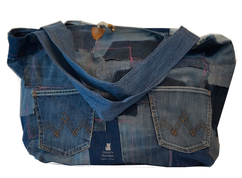 Borsone in denim in stile patchwork molto capiente con manici confortevoli. Fodera interna e tasca porta tutto. Disponibile sia nella misura large che medium.