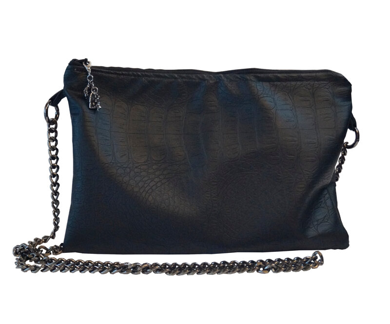 Borsa in eco pelle nera effetto coccodrillo, elegante, pratica e capiente con tasche interne di varie dimensioni.